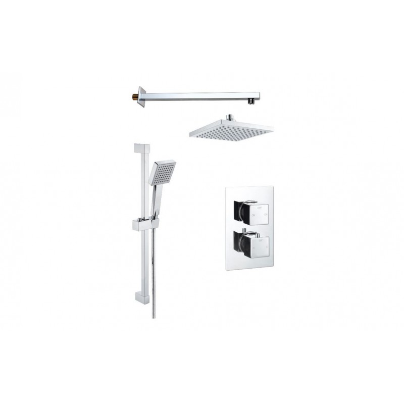 PRODUCT SPECIFICATION Finish: Matt Black Product Type: Contemporary Shower Construction: Body: Brass, Handles: ABS, Riser: SS, Handset: ABS, Top Head: SS, Hose: SS Cartridge Type: Thermostatic cartridge and divertor Inlet Connections: 3/4” BSP Outlet Connections: 1/2”BSP Fitting Dimensions: 150mm inlet centres Gross Weight (kg): 4.9