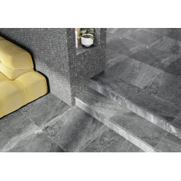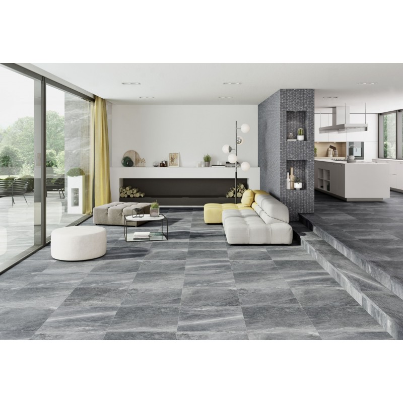 A tile that mimics black stone, 60x60 cm in size, in a dark gray color streaked with white veins. KARAKTER is a range that is inspired by the force of nature, which it replicates in any room. The smooth reliefs on these models accentuate their natural aspect.