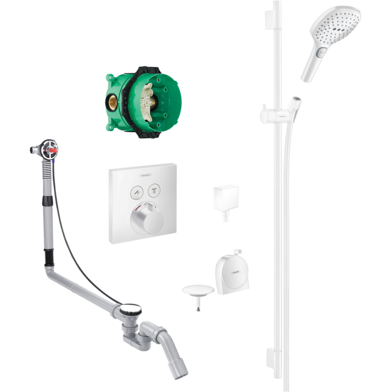 Consists of: hand shower, thermostatic shower mixer, shower bar, slider, soap dish Spray pattern: Rain, RainAir, Whirl Select button to comfortably switch between spray modes pivot connectors prevent hose from tangling 90° position adjustable slider, pivots left and right, up and down Maximum flow rate (at 3 bar): 15 l/min cannot be...