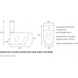 Includes Close Coupled Pan, Cistern & Seat onlyDimensions: H 830 x W 350 x D 630mmDistance from soil pipe spigot to wall: 225mmCoupling to soil stack: Straight Out & Straight DownCistern inlet position: LeftPush Button FlushComes With Soft Close SeatLift off the seat for easy cleaning, top fix hingesDual 6L & 4L flushN/B Please allow a...