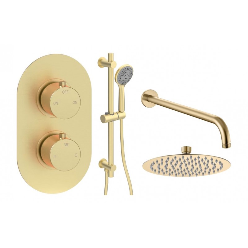 Two outlet thermostatic mixerPremium cast valve with brass cover plateIntegrated handset and elbow200mm brass shower head and brass armMinimum operating pressure 0.1 barComes with a 5 years guarantee on body and finish, 3 years for cartridge & 1 year for parts guarantee for peace of mind